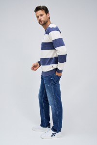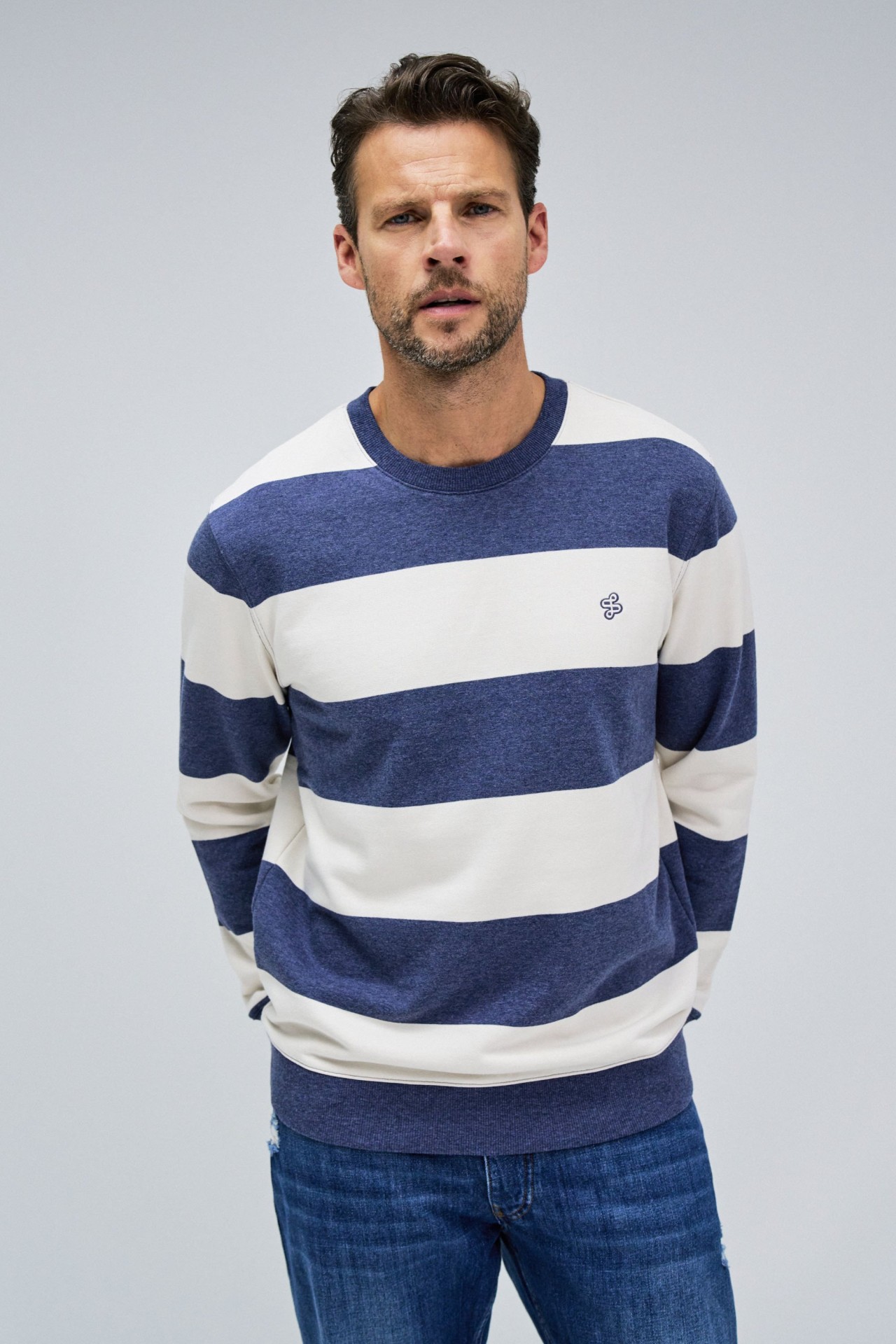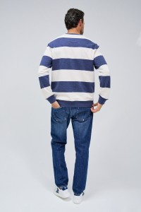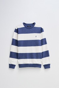 Sweatshirt with stripes. Raw and blue colour. Round neckline. Long sleeves with ribbed cuffs. Logo detail on the chest.